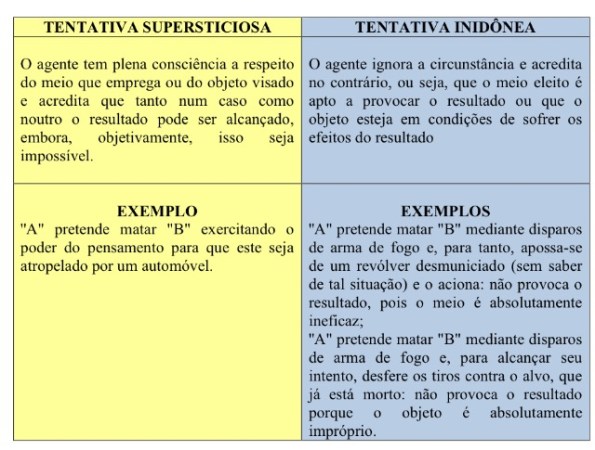 Exemplo: quando o agente pretende matar o inimigo praticando macumba. É forma de tentativa impunível, uma vez que o Direito penal não pune o pensamento ou a intenção. Ademais, por mais que o agente acredite, não é possível matar alguém apenas com crendices.