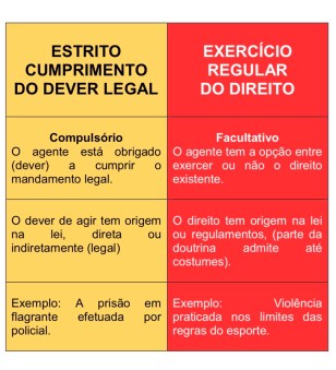 SE LIGA! Na teoria clássica, estrito cumprimento do dever legal e exercício regular do direito são excludentes de ilicitude.