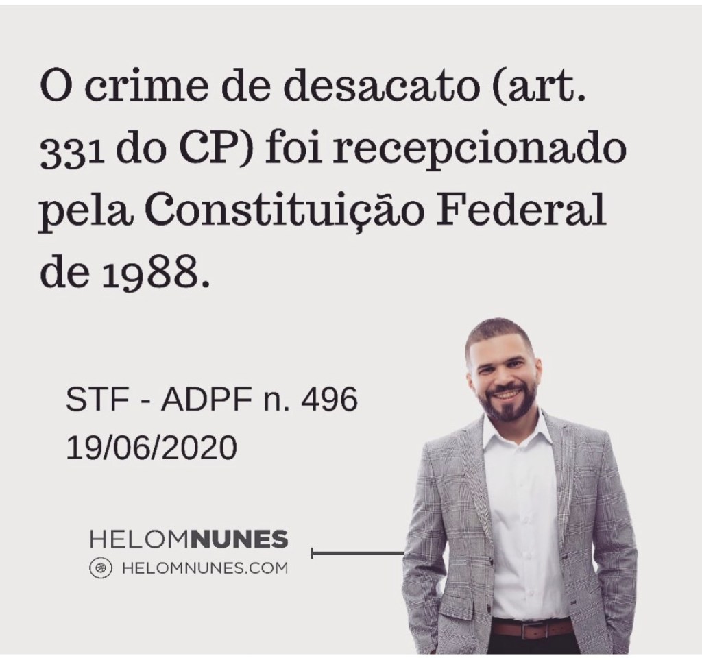 O Supremo Tribunal Federal firmou entendimento em sede de controle de constitucionalidade – ADPF n. 496 – que o crime de desacato (Art. 331 do CP) foi recepcionado pela Constituição Federal de 1988
