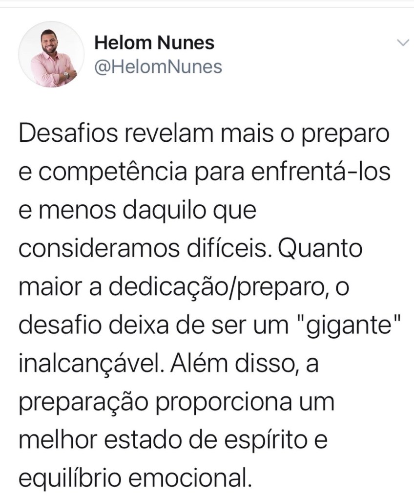 O desafio será cada vez mais um “grande e terrível gigante” enquanto não nos preparamos. A preparação e a dedicação, além de capacitar habilidades e conhecimento repercutem em confiança, tranquilidade.