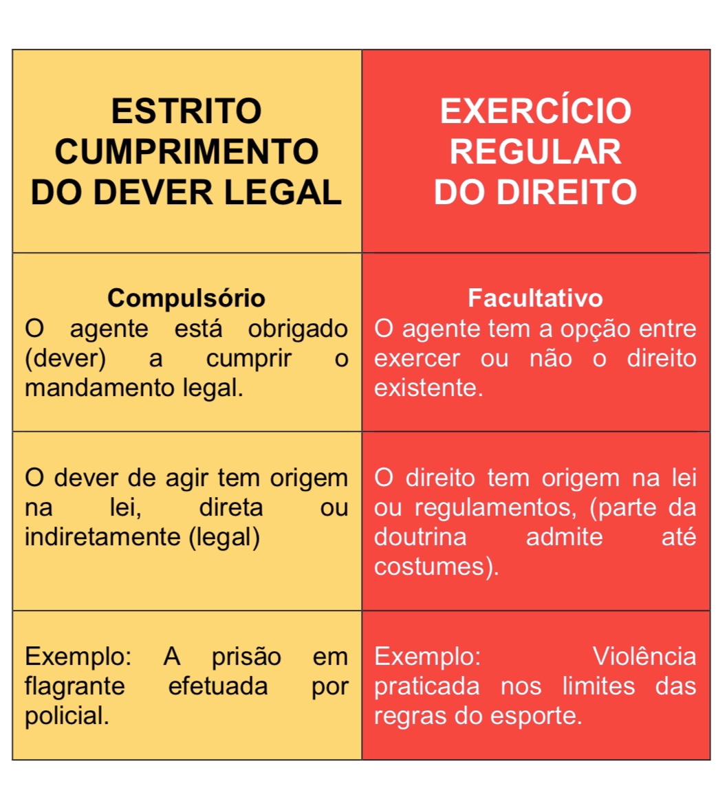 SE LIGA! Na teoria clássica, estrito cumprimento do dever legal e exercício regular do direito são excludentes de ilicitude.