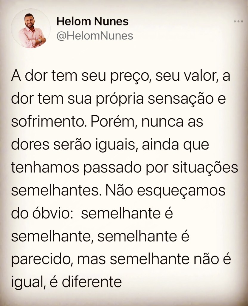 A dor tem seu preço, a dor tem seu valor, a dor tem sua própria sensação e sofrimento. Porém, não esqueçamos do óbvio: As dores emoções a amores nunca serão iguais, ainda que tenhamos passado por situações semelhantes. Afinal, semelhante é semelhante, semelhante é parecido, mas semelhante não é igual, semelhante é diferente.